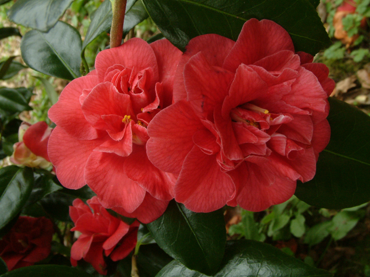 Flowers: large (to 11cm) semi-double, with a boss of stamens; imbricated dark red.