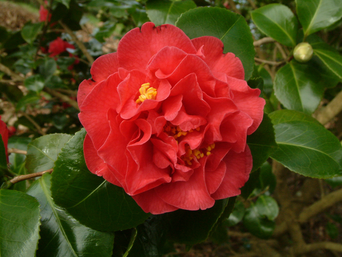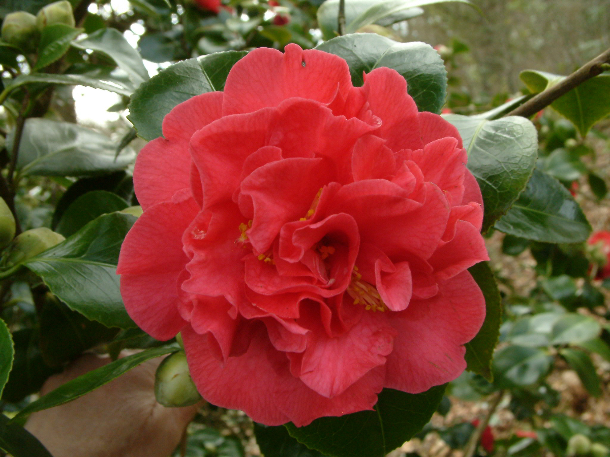 Flowers: large informal double with inward folding petals and golden stamens among them; brilliant salmon rose.