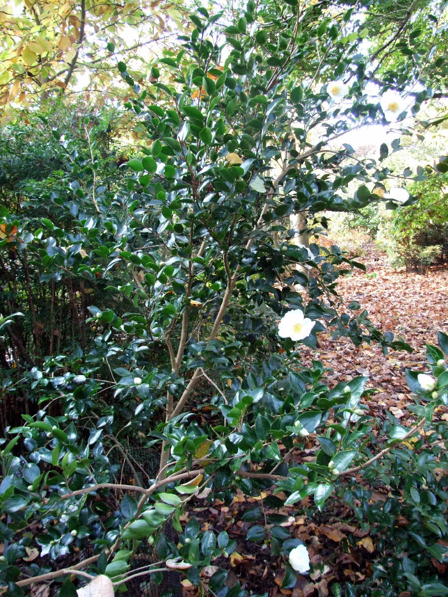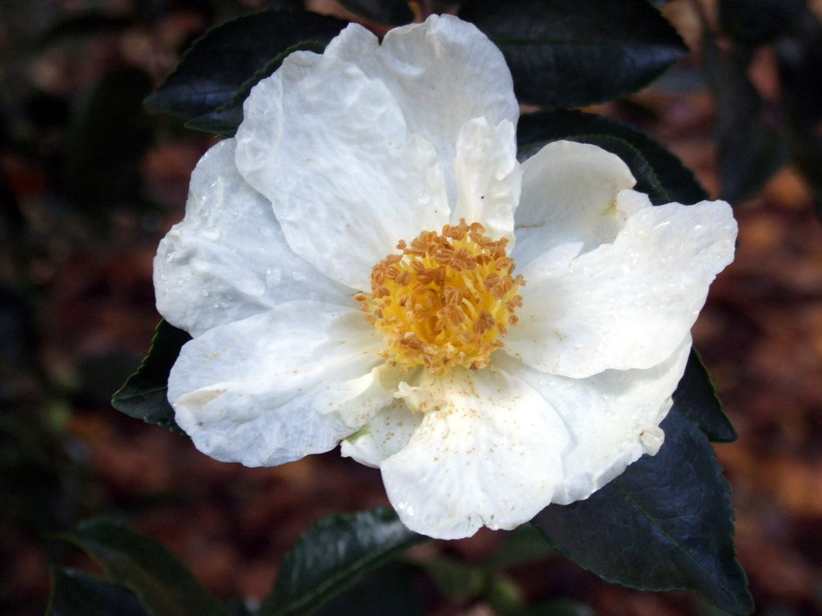 Camellia sasanqua 'Ben'1994 Flowers: large, white, single flower, with yellow stamens.