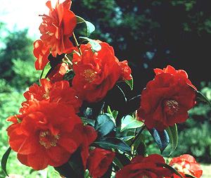 Flowers: large to very large (averaging 11cm),irregular semi-double; a brilliant dark red.