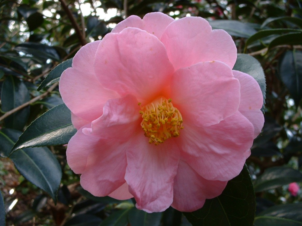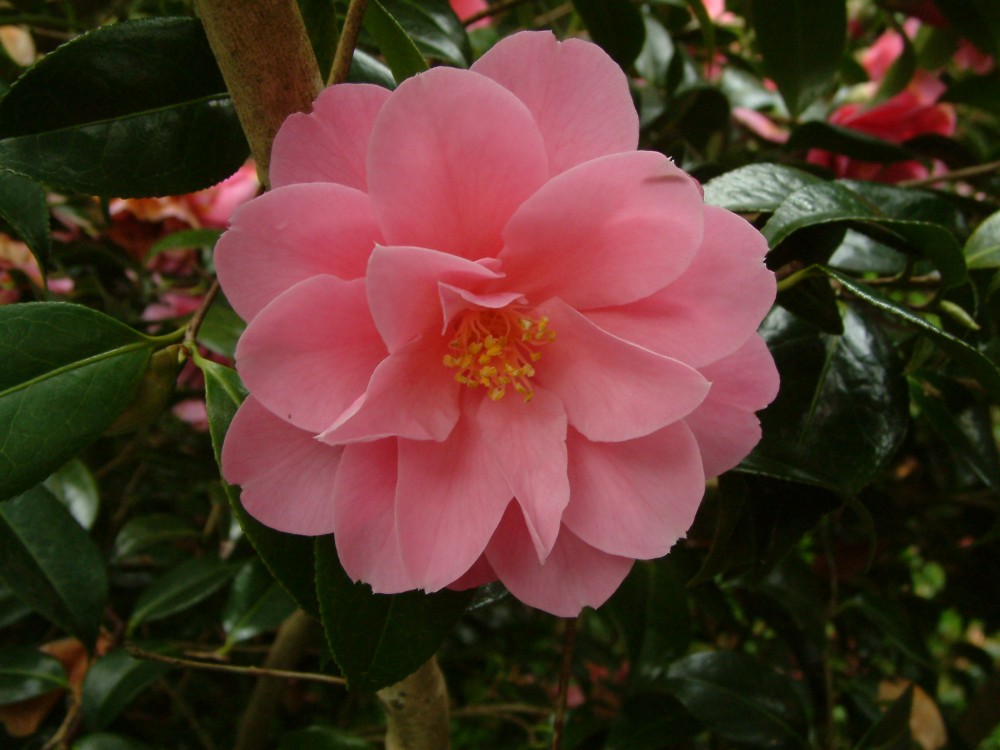 Flowers: large, semi-double, with a prominent boss of amber stamens tipped copper; pink with silver