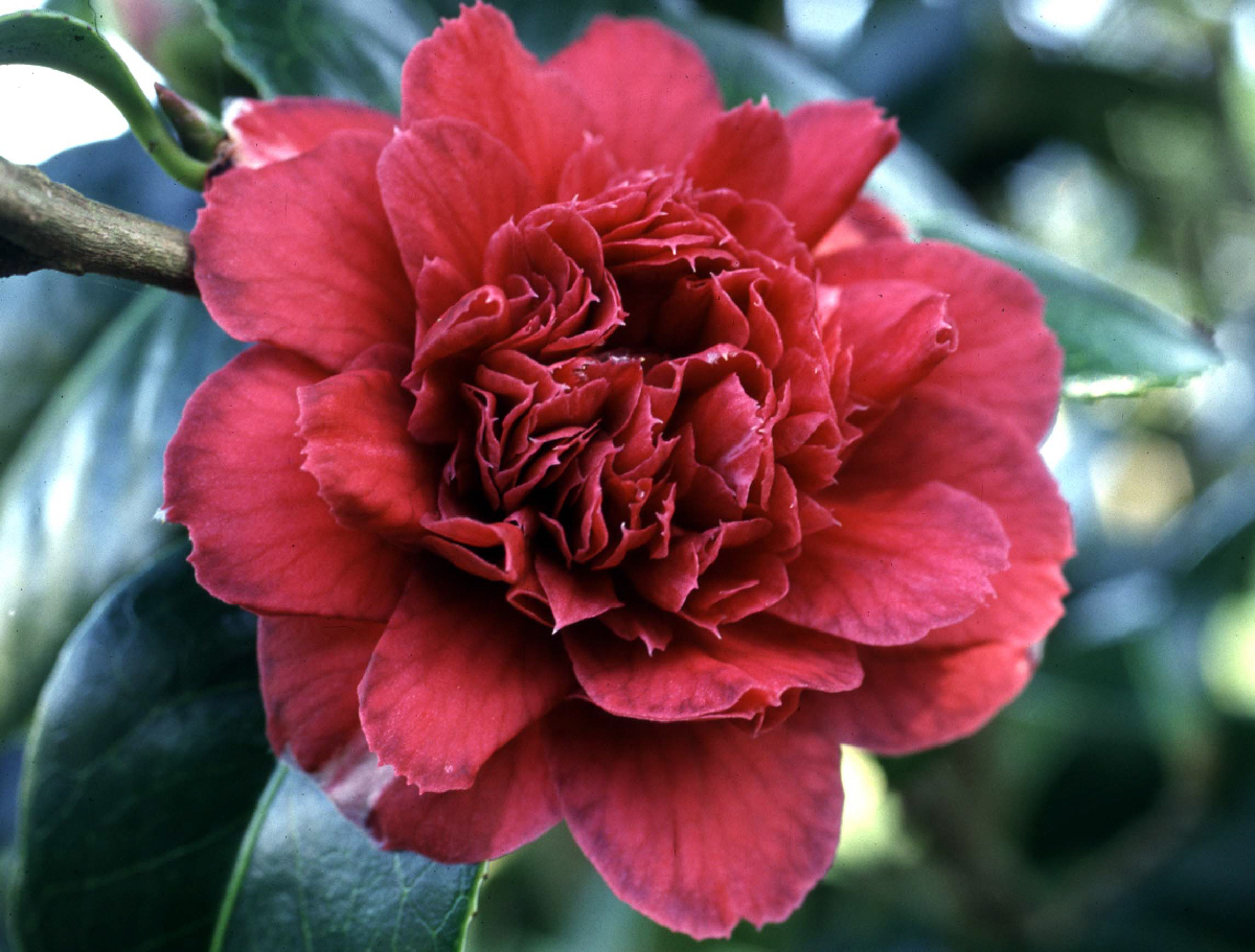 Flowers: Peony type, medium sized; rose-red blossom washed pomegranate purple; outer petals turned down and curled under at tips; inner petals, irregular, upstanding; lemon tipped stamens.