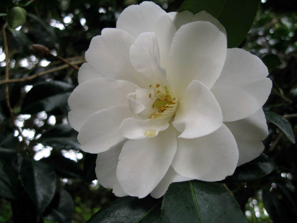 Flowers: a striking white semi-double with a boss of stamens; to 8cm across.