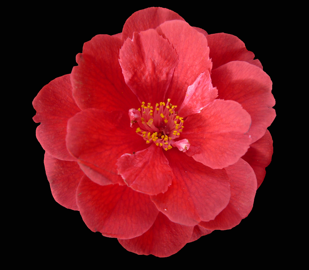 Flowers: 9-12cm across, semi-double, striking cardinal red, with dark veining, contrasting with lemon-yellow stamens.