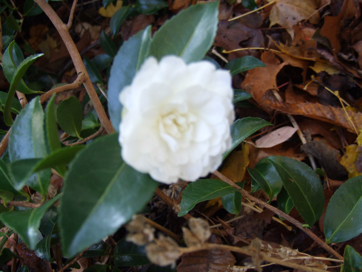 Flowers: 8.5cm across, rose-form double, pure white, with many rounded and notched petals and just a few pale gold stamens.