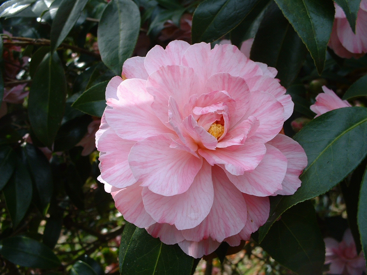 Flowers: medium to large - semi-double to rose form with the inner petals incurved; clear pink with white stripes, deeper on the reverse,