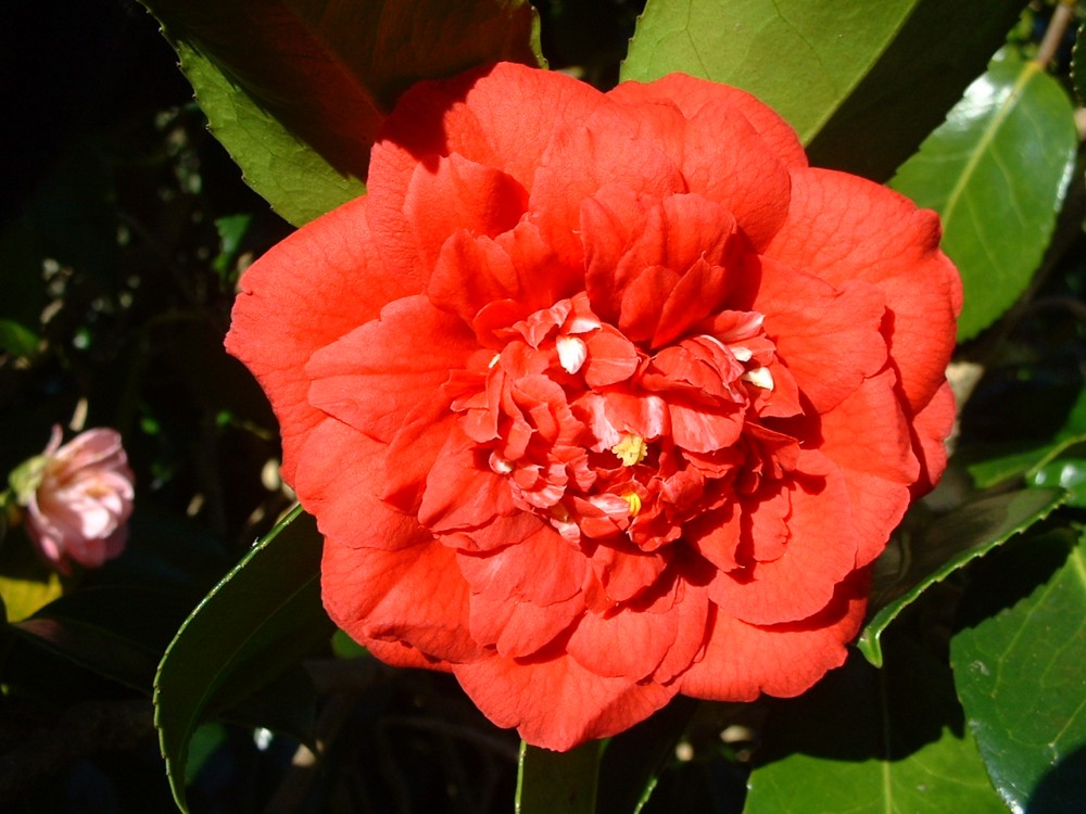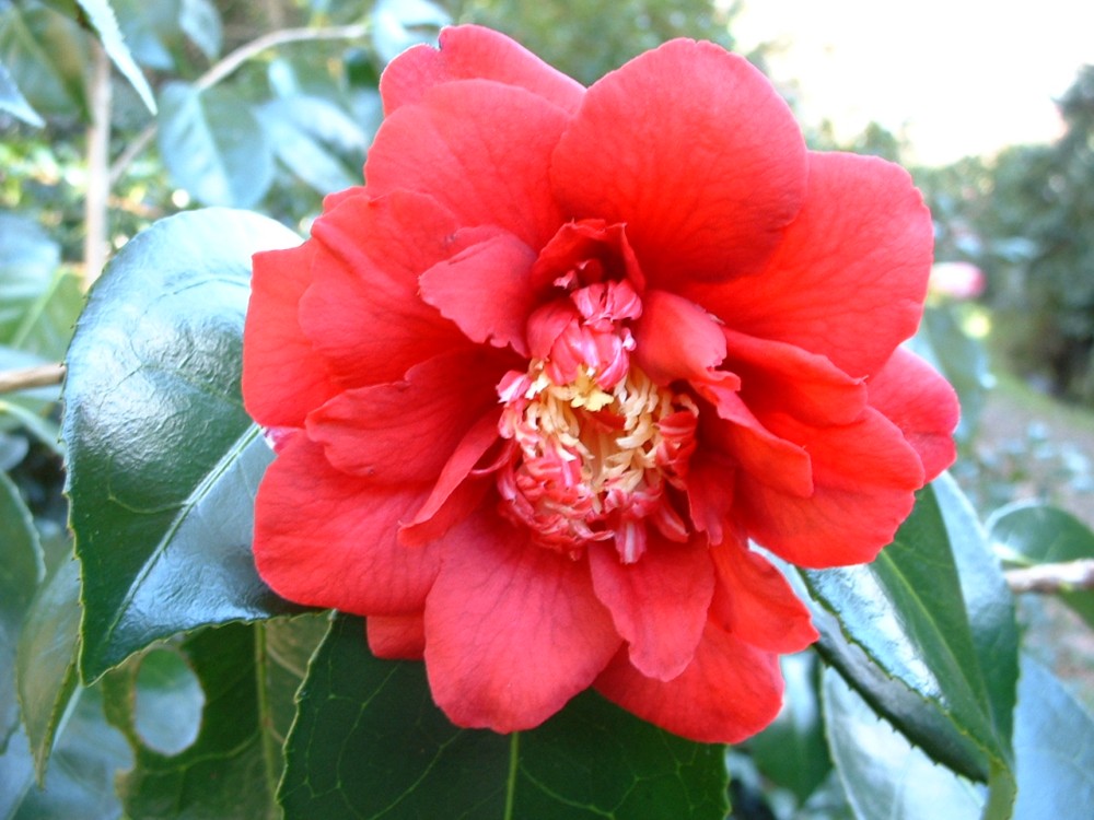 Flowers:large to very large (to 13cm) semi-double to anemone form out of doors; inside, a massive anemone form; deep glowing red.