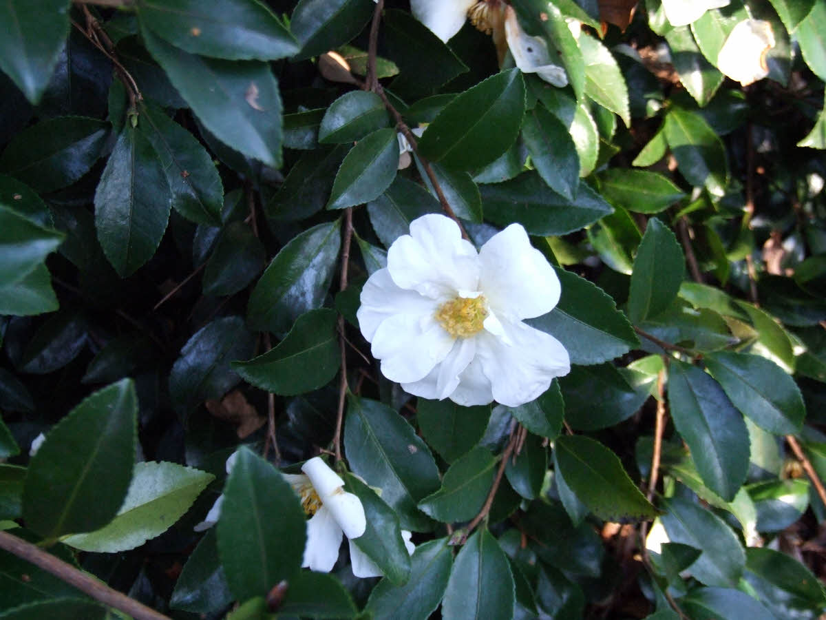 Camellia sasanqua 'Kenkyo' Flowers: single, scented white flowers with a boss of golden stamens. Autumn / Winter Leaves: luxuriant rich green. Habit: Average, open, evergreen shrub, 2m after 10 years.