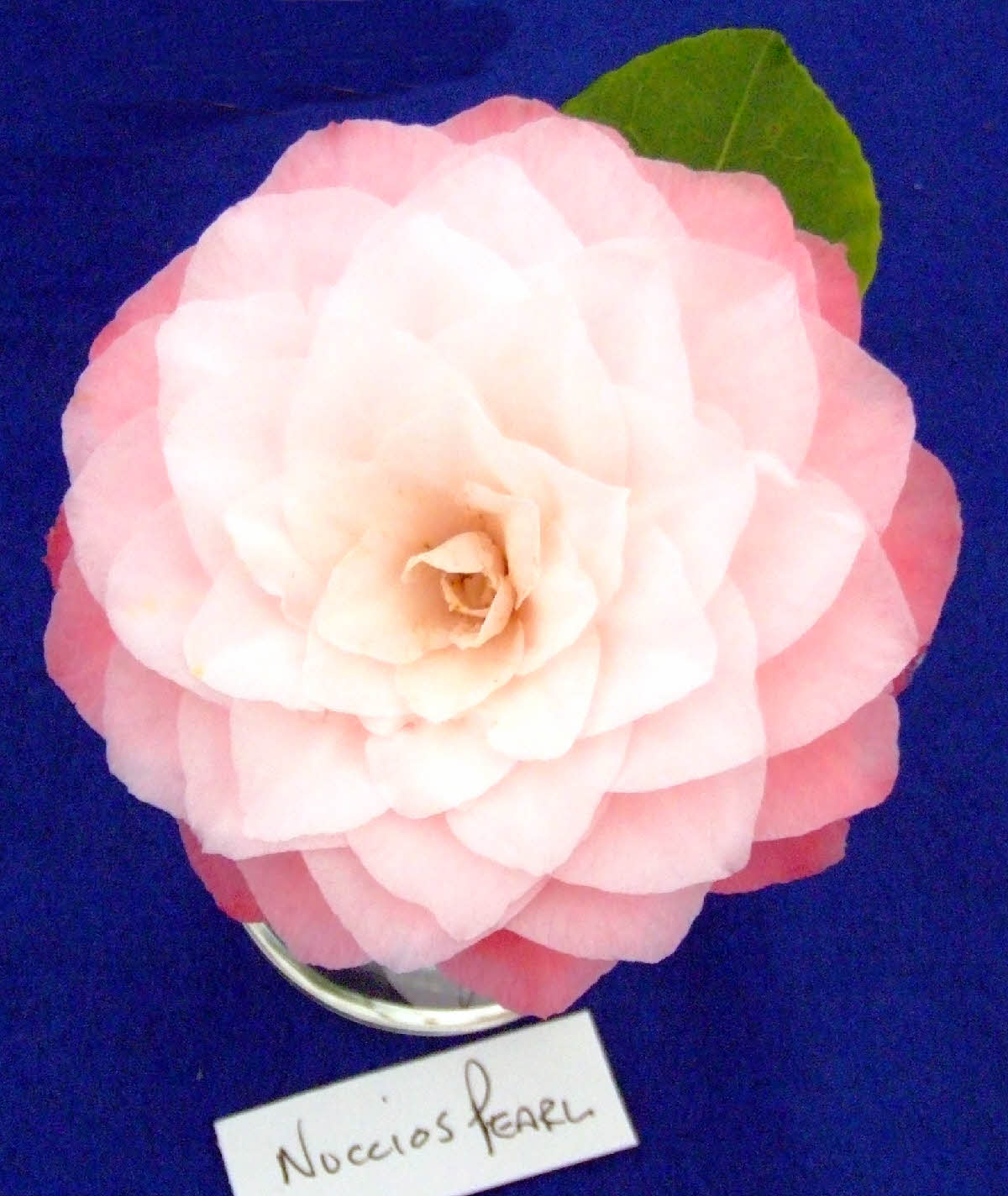 Flowers: 8cm, formal double, similar on colour to Nuccio's Jewel. Rounded petals have a pointed tip, especially accentuated in young blooms on well-fed plants, which have a strong pink margins.