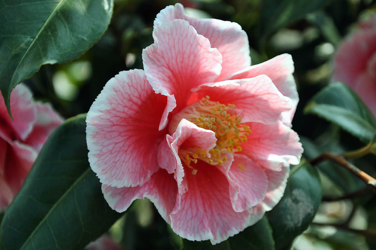 Flowers: 8-10cm, semi-double, a striking rose-veined pink, deepening in intensity towards the base of the petals, which are edged and occasionally mottled white.