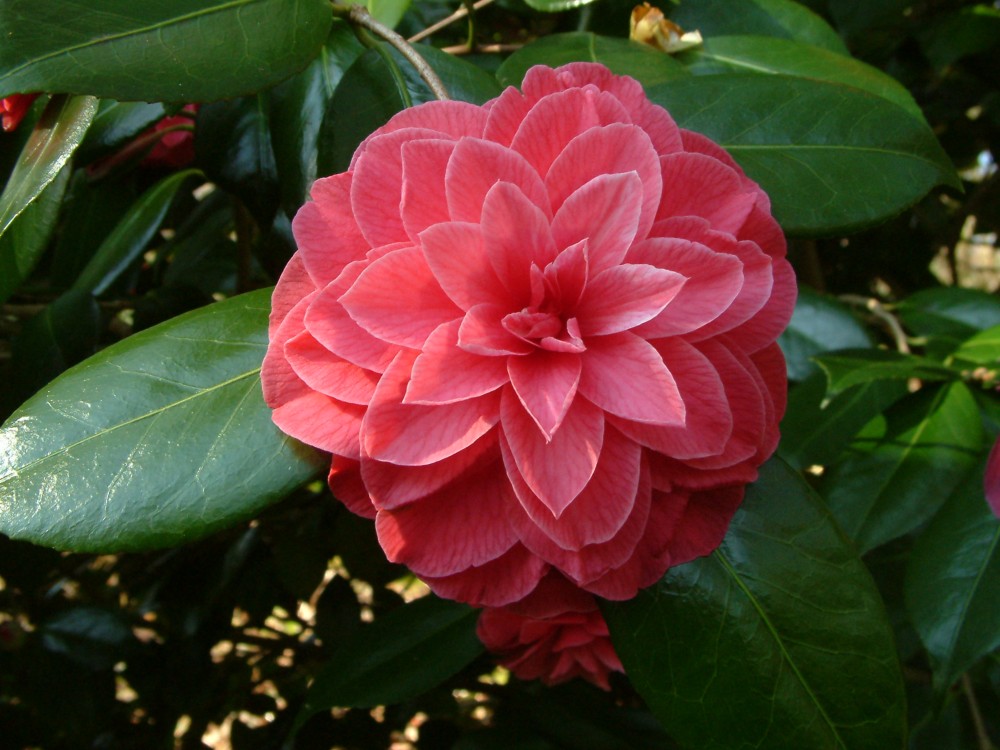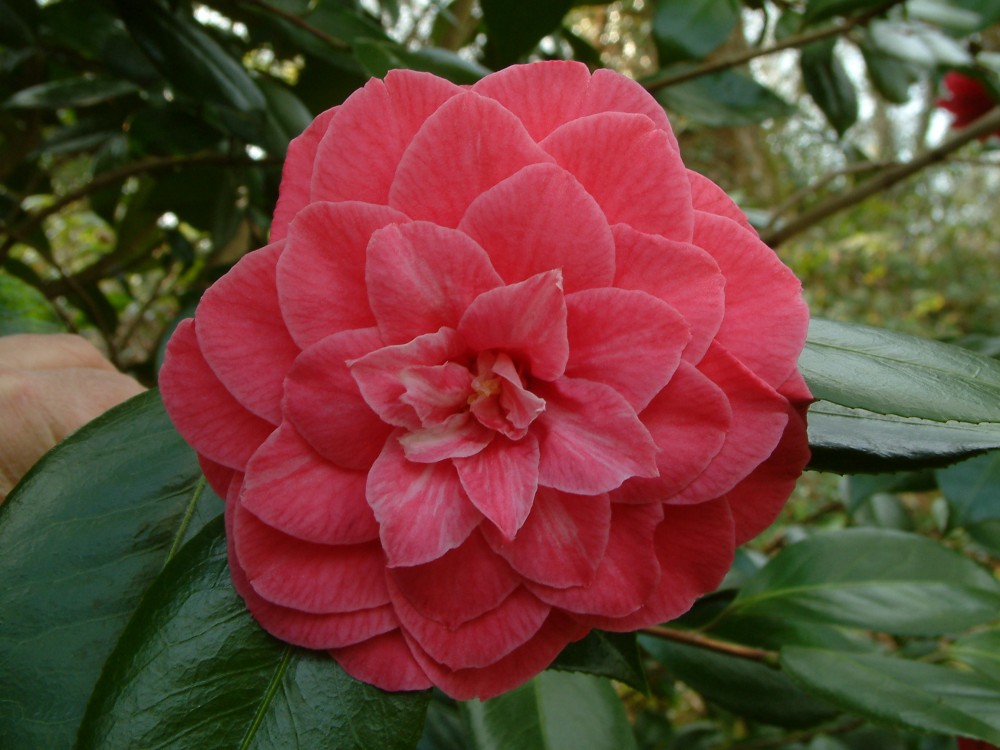 Flowers: large double to rose form with broad petals; crimson with darker veining.