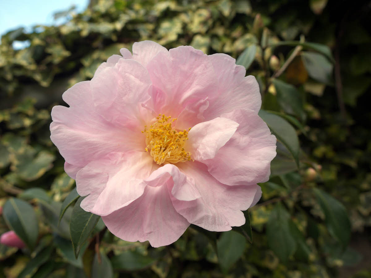 Flowers: Delicate pale pink. Very large single to semi-double.