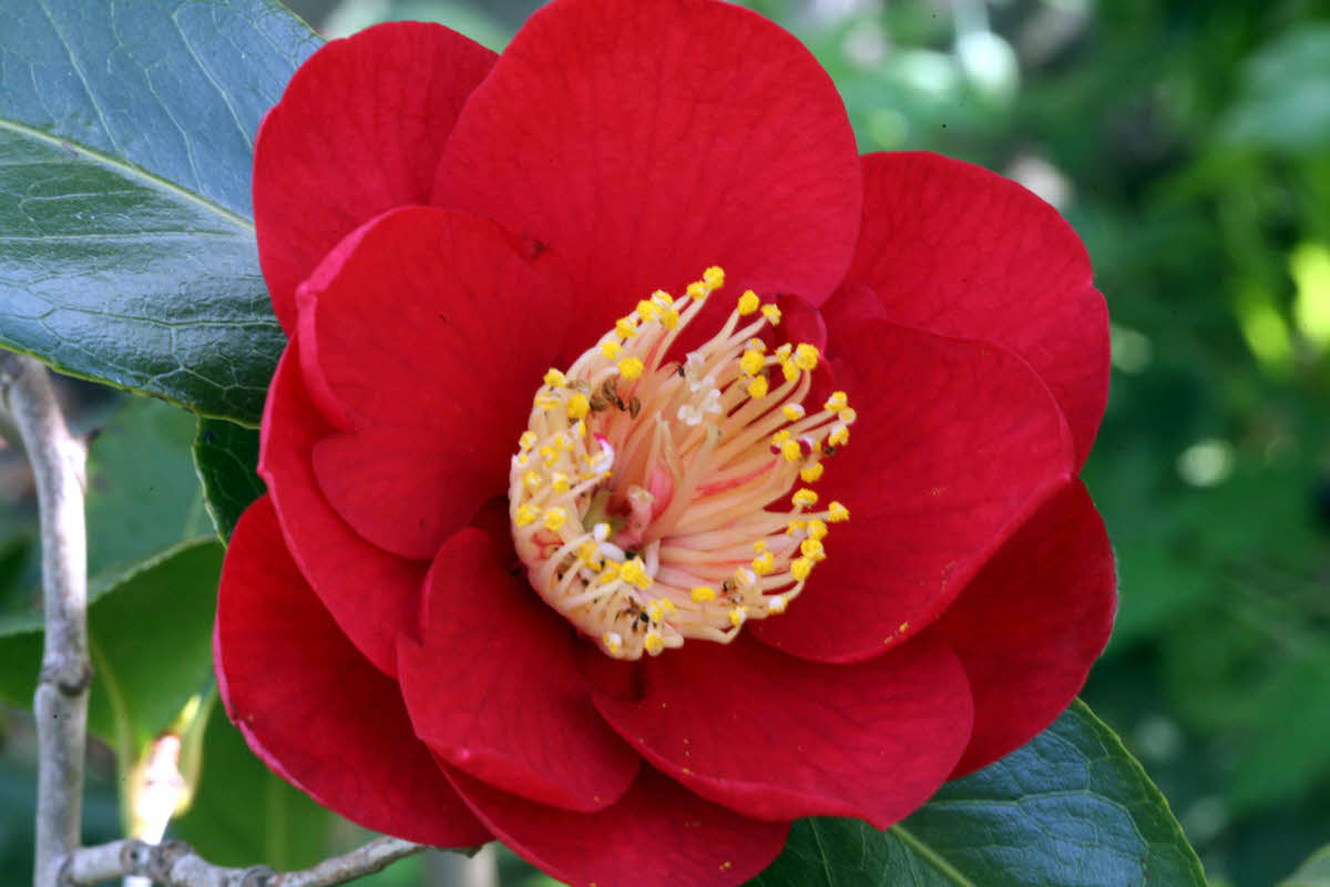 Flowers: large (to 10cm) semi-double; a glorious dark red with a prominent circle of yellow stamens.