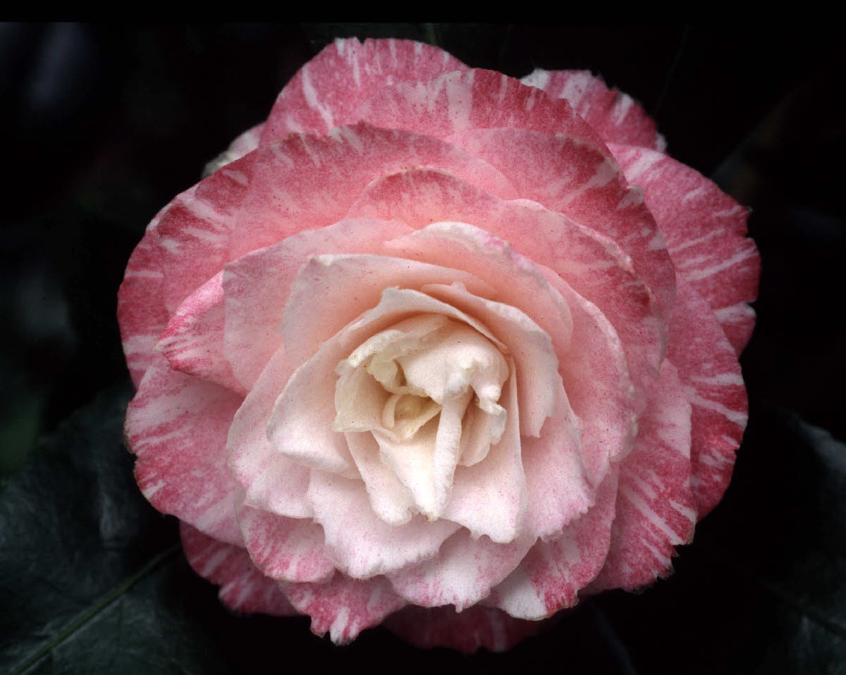 Flowers: miniature, 5-6cm across, 3.8-5cm deep, formal double, often opening star-shaped, white with pink border.