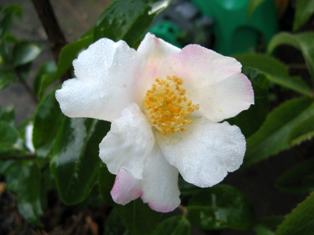 Flowers: 5 x 2.5cm, about 7 petals, single,vminiature white marked with pink, yellow anthers and cream filaments.