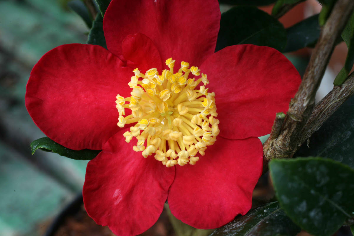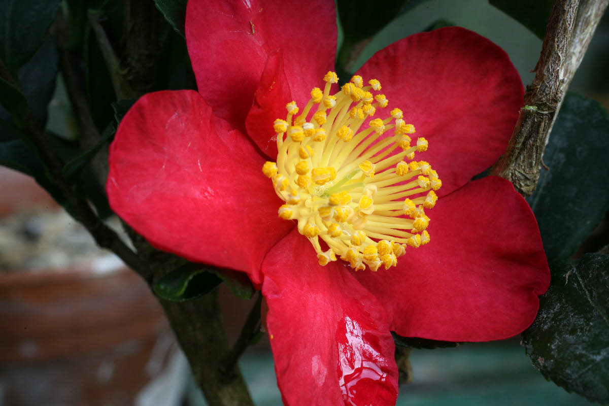 Flowers: 7.5cm across, single, brilliant glowing red petals surrounding tight centre of golden stamens.