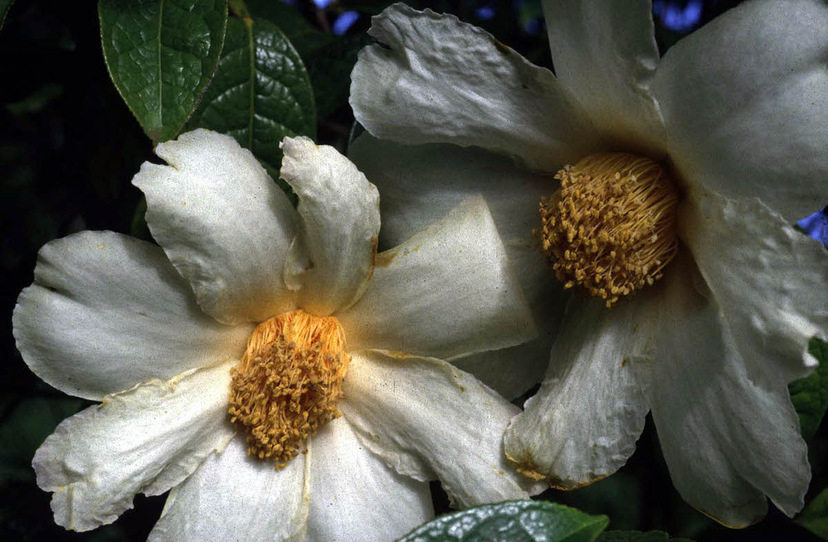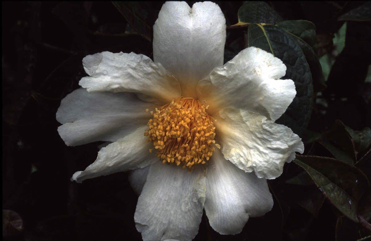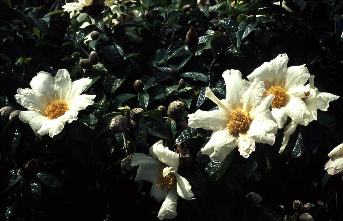 Flowers: white, and borne singly at the tips of shoots, 100-140mm across, with 9 or 10 long, narrow, notched petals, occasionally very slightly tinged pink on the margins. The stamen cluster is very attractive, bright golden yellow with an orange tint to the anthers. It blooms profusely, pollinates readily in warm climates and sets seed well, making it very useful for hybridisers.