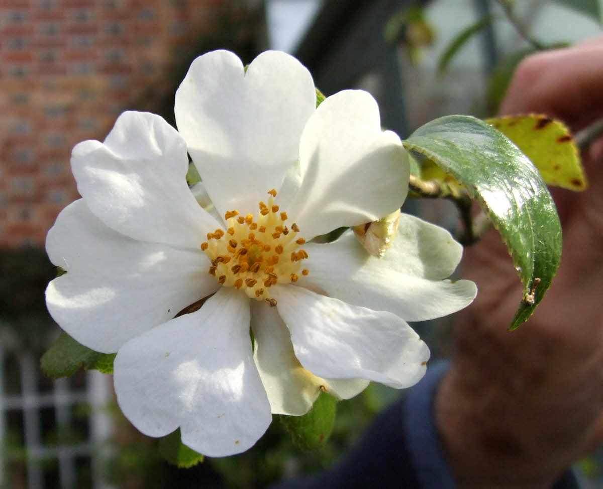 The flowers are 5-6cm across, the six petals are white, flare out from the centre, widely spaced, with a distinct taper to the base, wavy notched margins, light in structure and easily damaged; produced at the tips or shoots or in the axils of leaves along the stems.