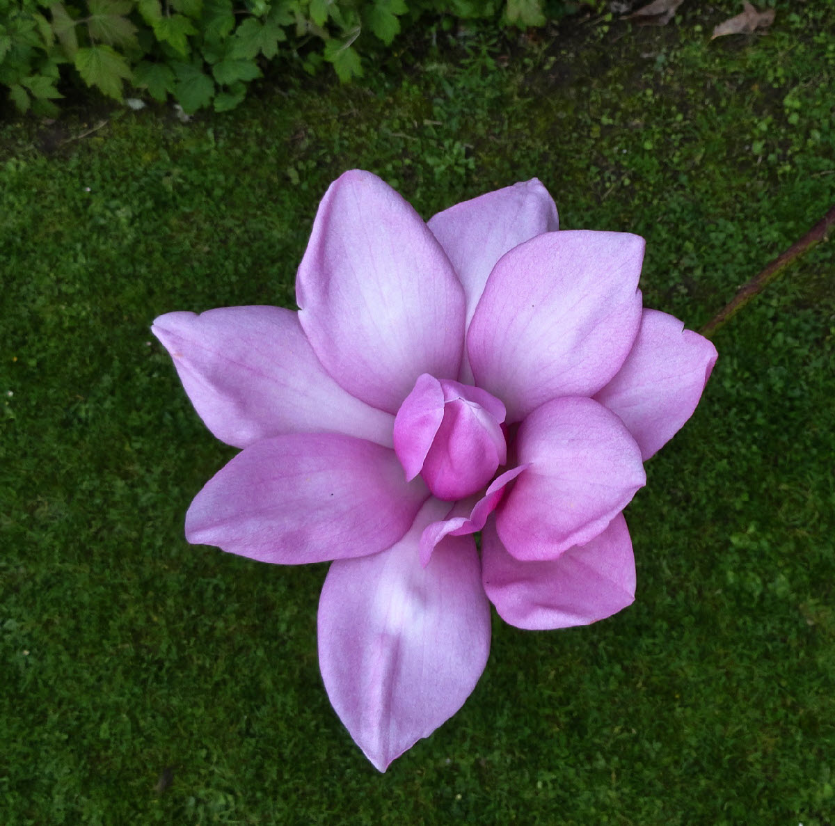 Flowers: 11 tepals, 27.5 - 30cm in diameter; cup and saucer shaped deep pink flowers fading to cream on the inside of the tepals.