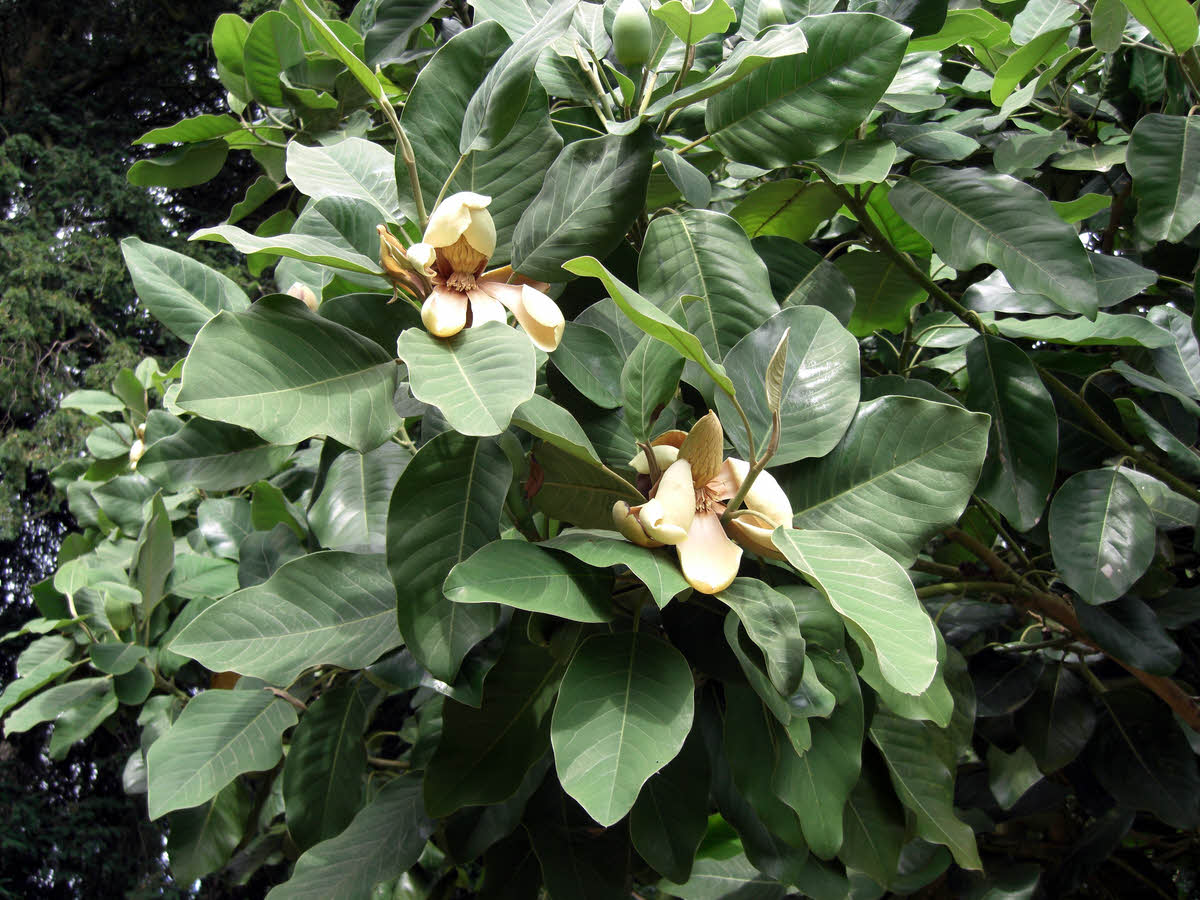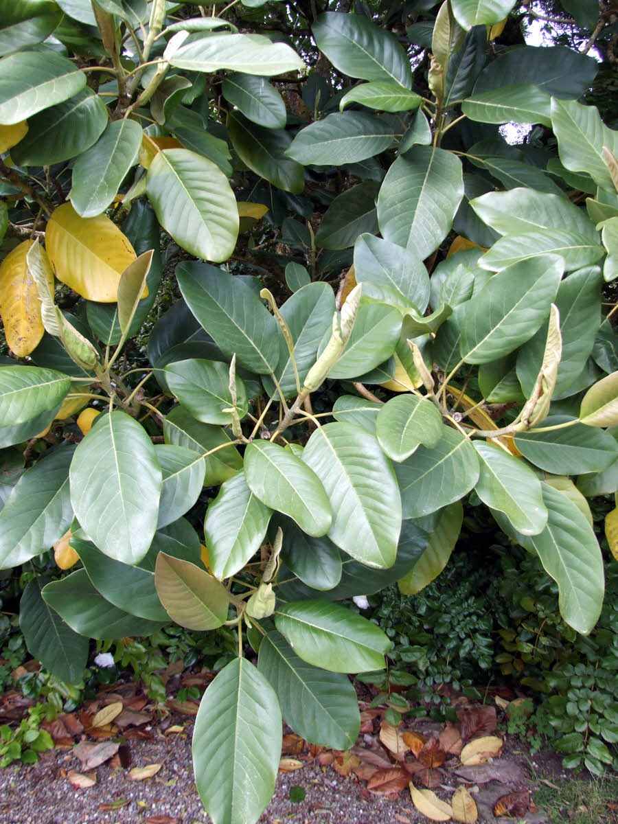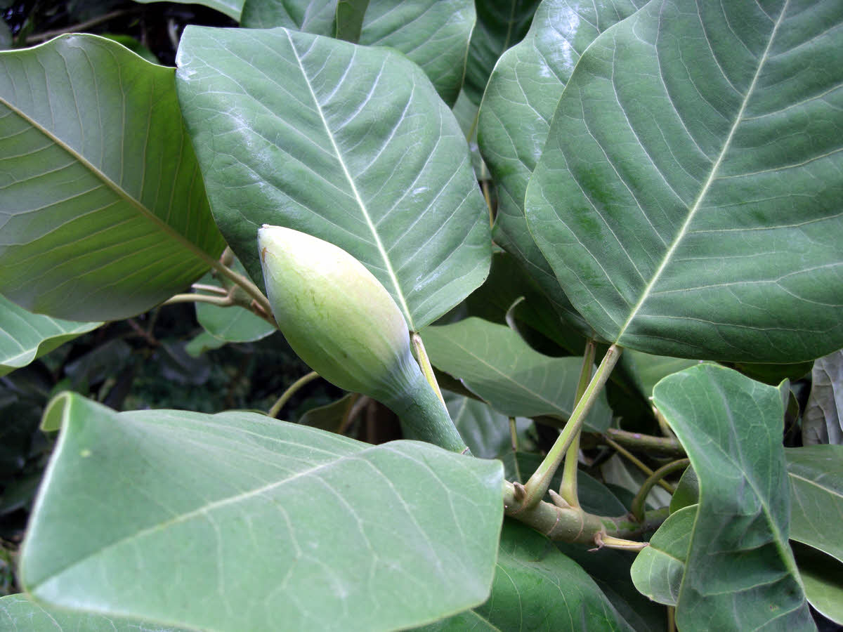 Leaves: oblong-ovate, 100-200mm long and 50-100mm wide, tough, leathery matt green, with a 50-70mm petiole.
