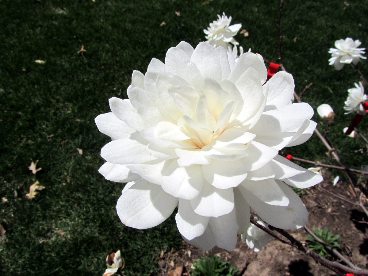 Flowers: resemble pomopom chrysanthemums, 52 tepals, 10-12.5 cm across, white.