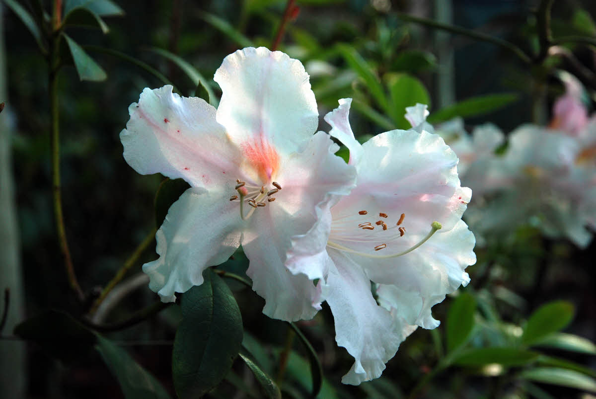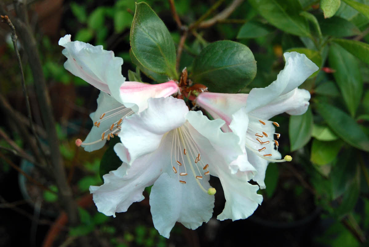Flowers: 3/truss, 90mm wide, white, flushed sulferino purple and striped on outside.