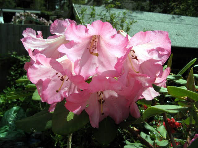 Flowers: 8-10/lax truss, trumpet-shaped, 75 x 100mm, 5-6 lobed, soft pink, with 1-2 faint crimson rays; sweetly scented; nectaries crimson.