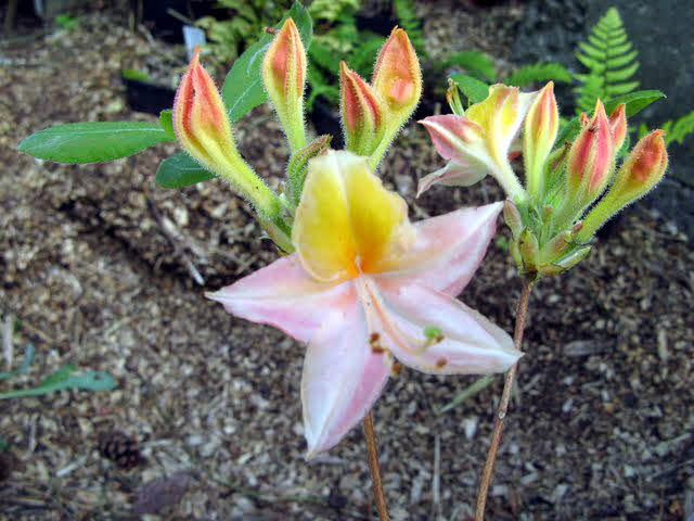Flowers: pale rose, with deep rose stamens and yellow dorsal lobe.