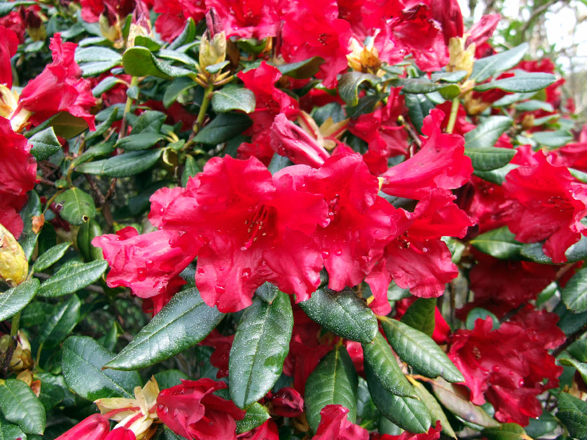 Flowers: 6/lax globular truss, open funnel-shaped, 45 x 50-65mm, red with veining and spotting on lower lobes of strong red.