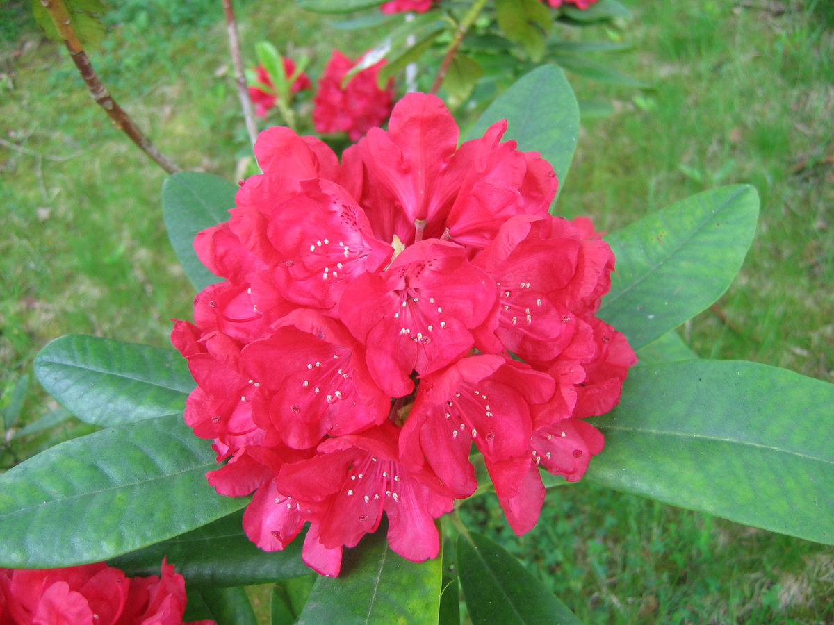 Flowers: 14-18/hemispherical truss, broadly funnel-shaped, 40-45 x 60-70mm, ruby red,