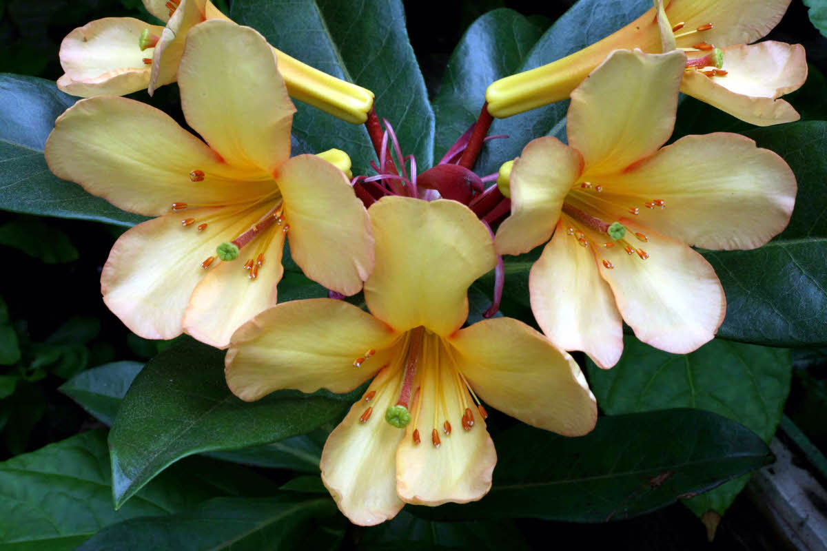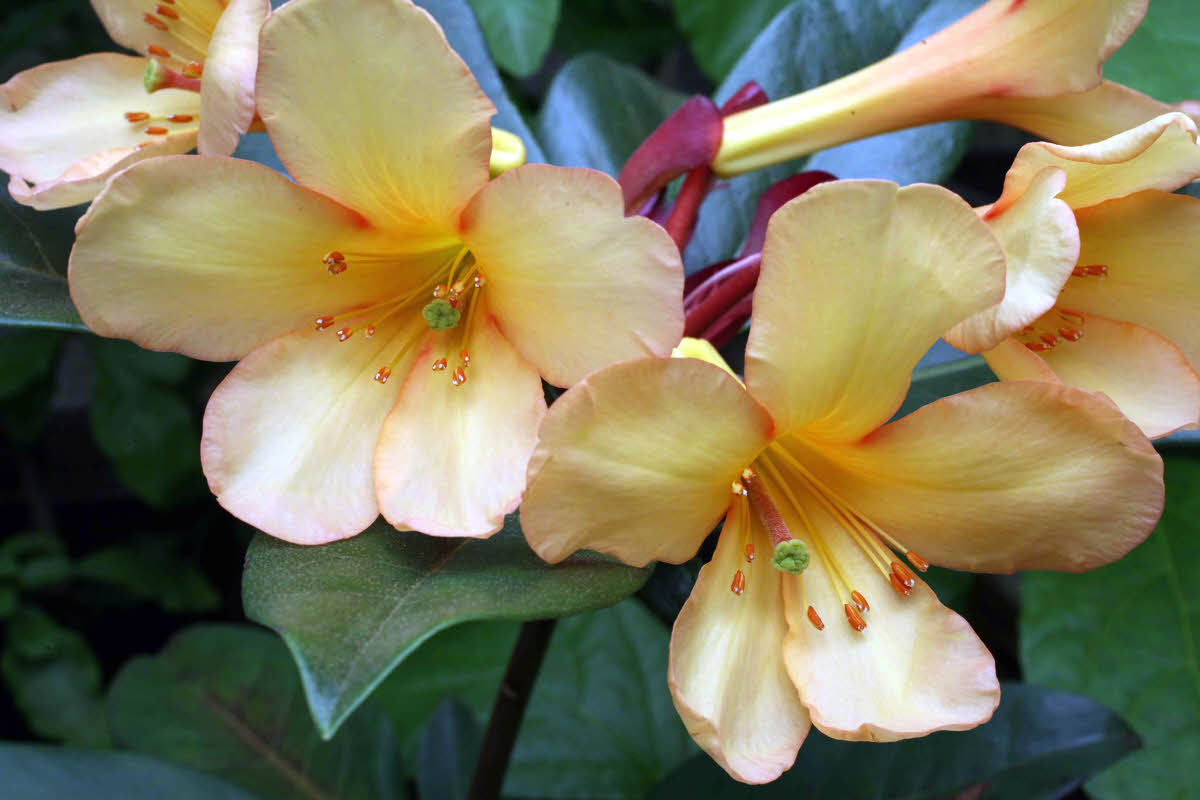 Rhododendron 'Bold Janus'leucogigas x laetum Flowers: 7/truss, tubular funnel-shaped, 90x100mm, 5-lobed, light yellow, flushed pink on edges of lobes. Foliage: elliptic.