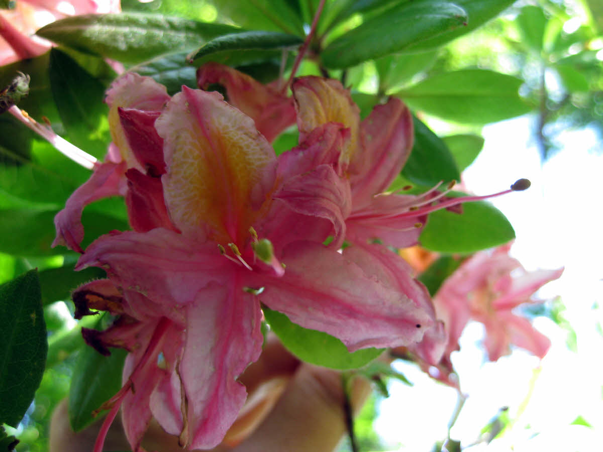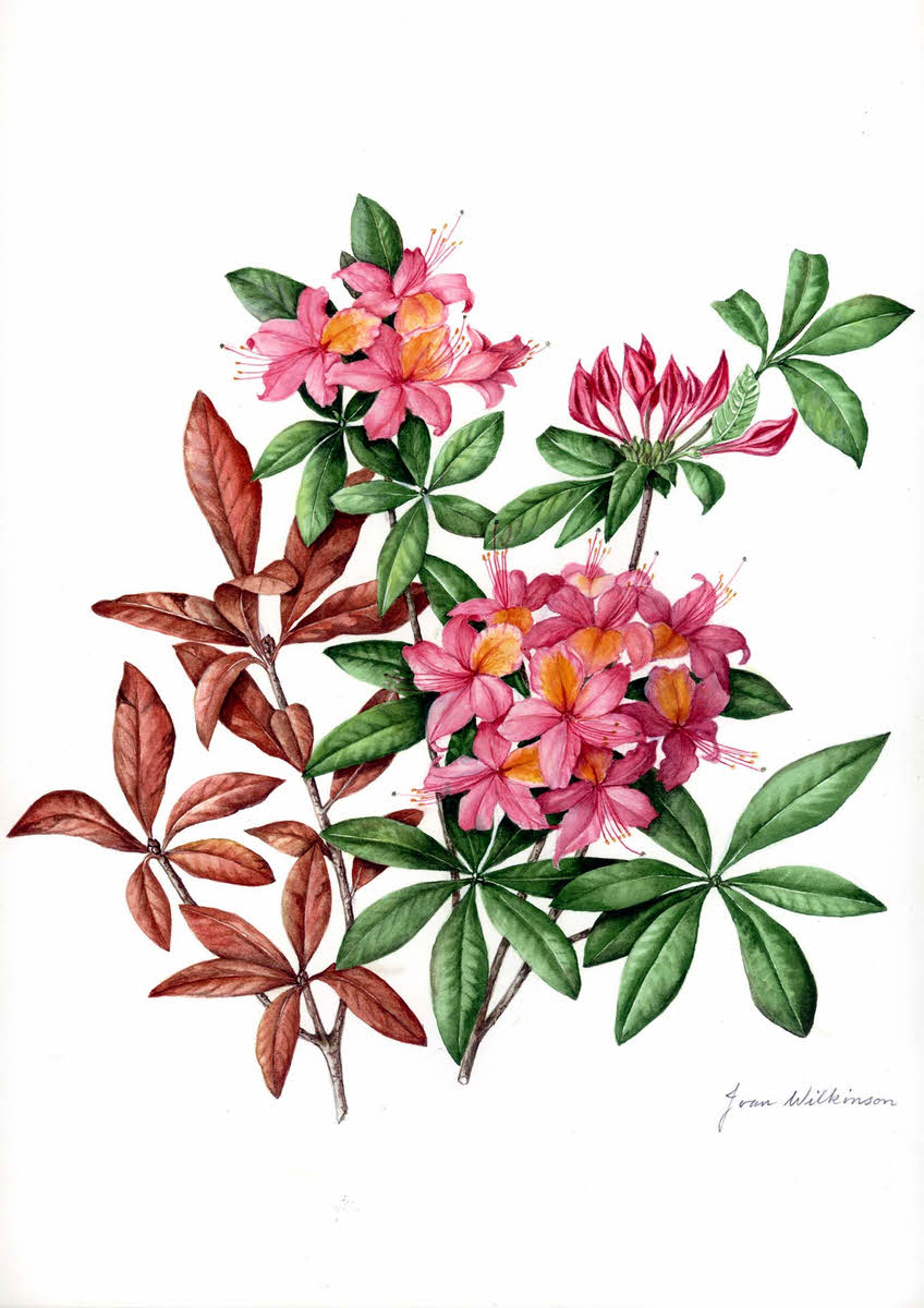 Flowers: single, 10-12/loose truss, broadly tubular funnel-shaped, 50 × 50mm, with 5 wavy-edged lobes, deep purplish pink (61D) in bud, opening inside pale purplish pink (62D) flushed light purplish pink (63D),outside strong purplish pink (63C); vivid yellow (14A) blotch on the dorsal lobe; scented. Calyx 5mm long, moderate yellow-green (143D).