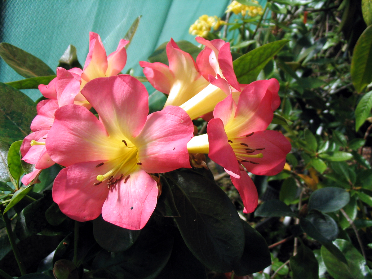 Flowers: 5-7/flat or slightly conical truss, 65mm long, deep pink at tips,