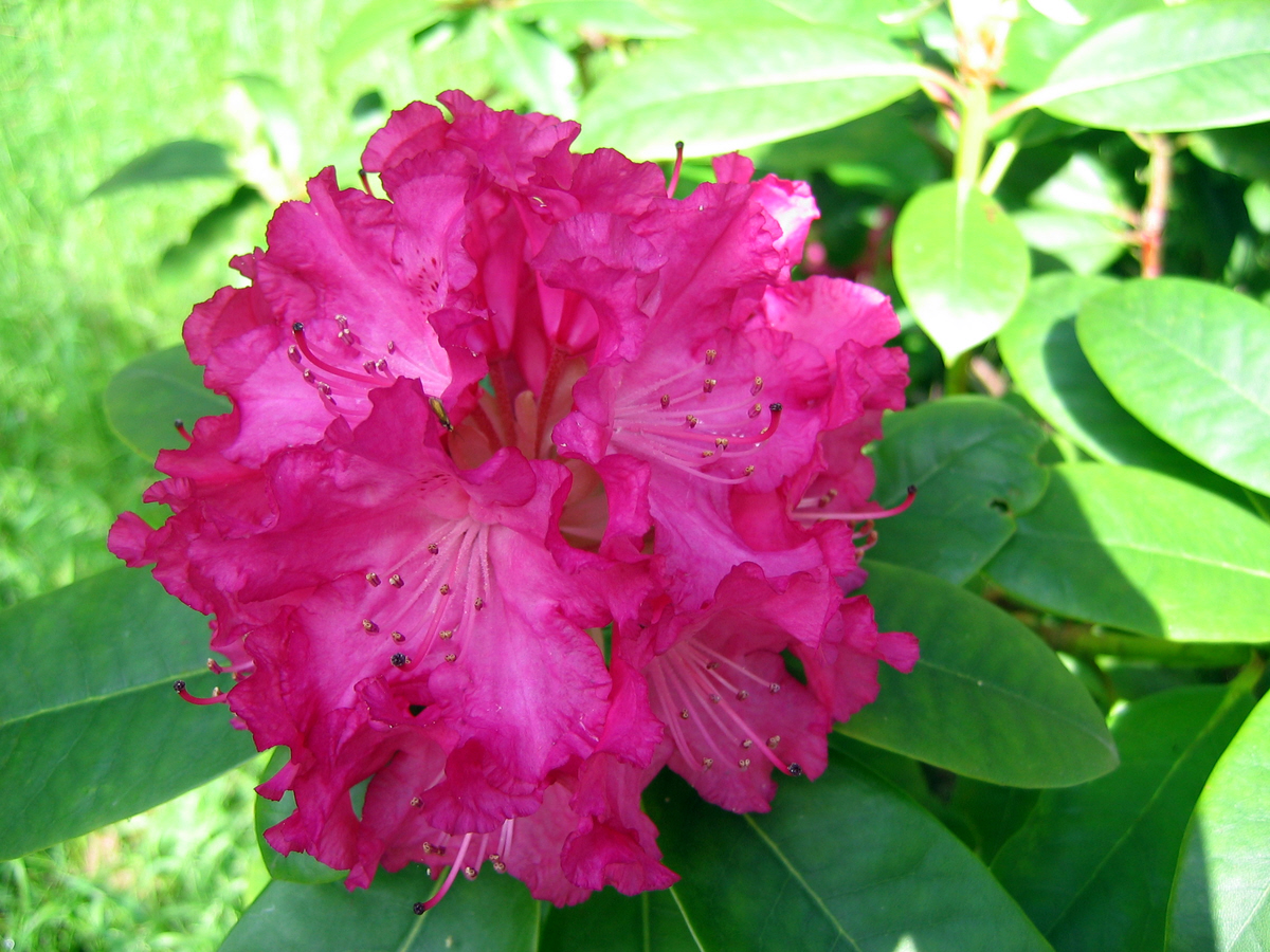 Flowers: 14-17/dense, rounded truss, broadly campanulate, 40 x 60mm, purplish crimson, with a few, dark, dorsal spots.