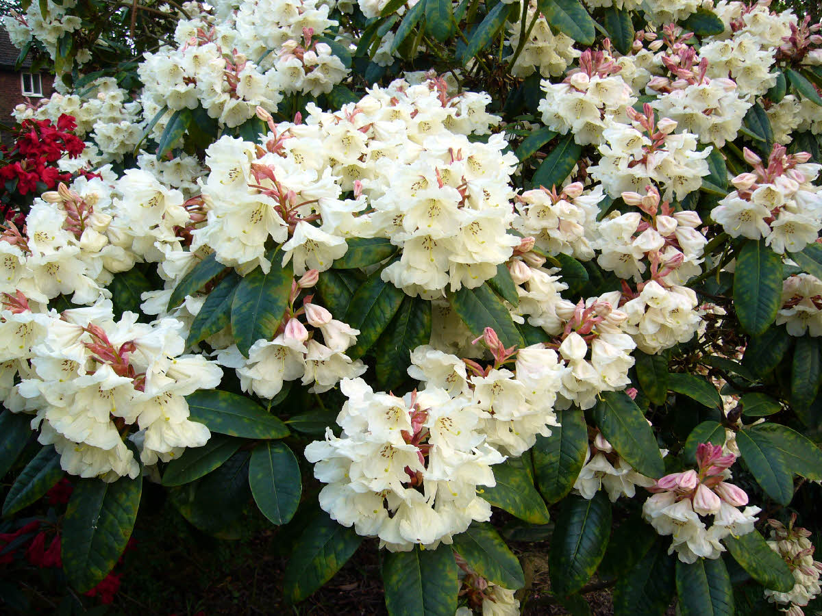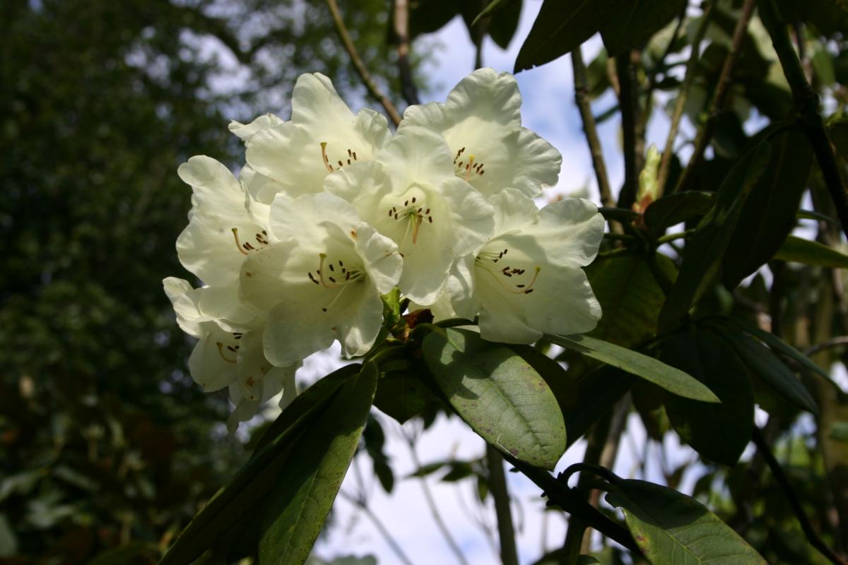 Flowers: 12-17/compact, domed truss, broadly funnel-campanulate, 60-65 x 75-90mm, with wavy-edged lobes, creamy white,