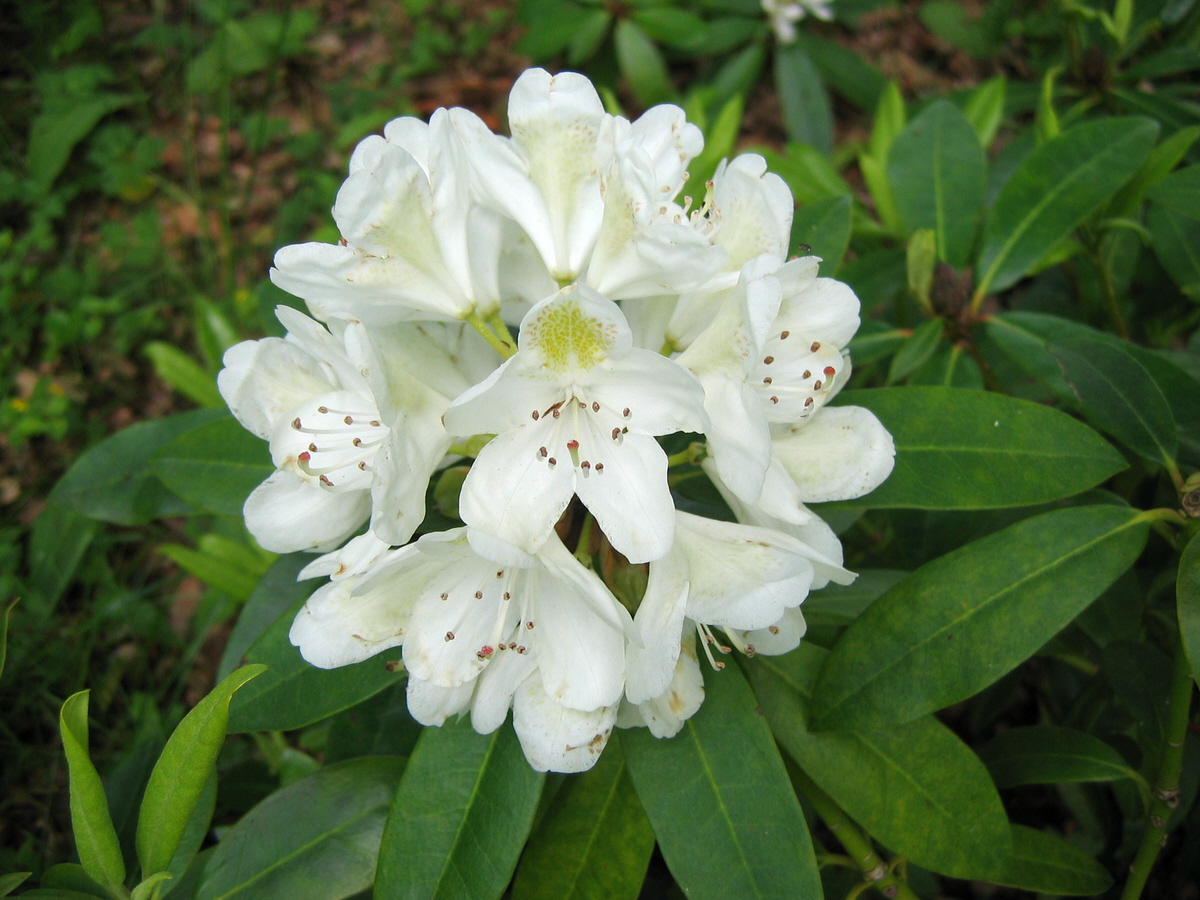 Flowers: 12-18/fairly compact, broadly-rounded truss, 35-50mm wide, pure white, with a brilliant yellow dorsal blotch.