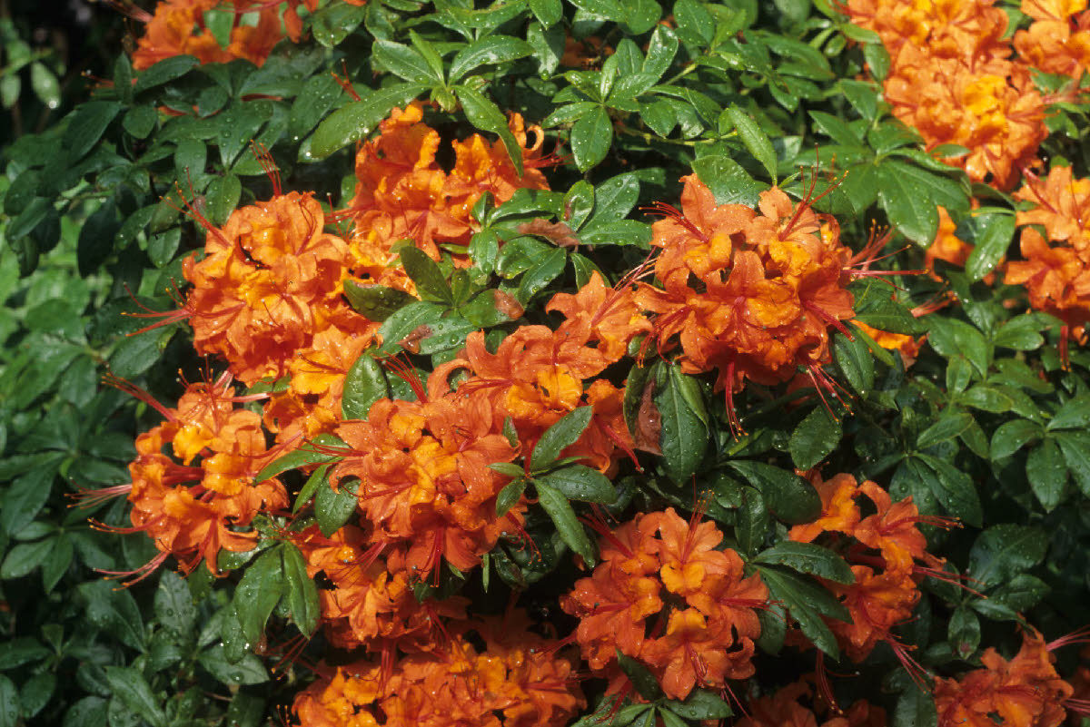 Flowers: rounded trusses of about 14 flowers: brilliant orange-red with a strong orange blotch;