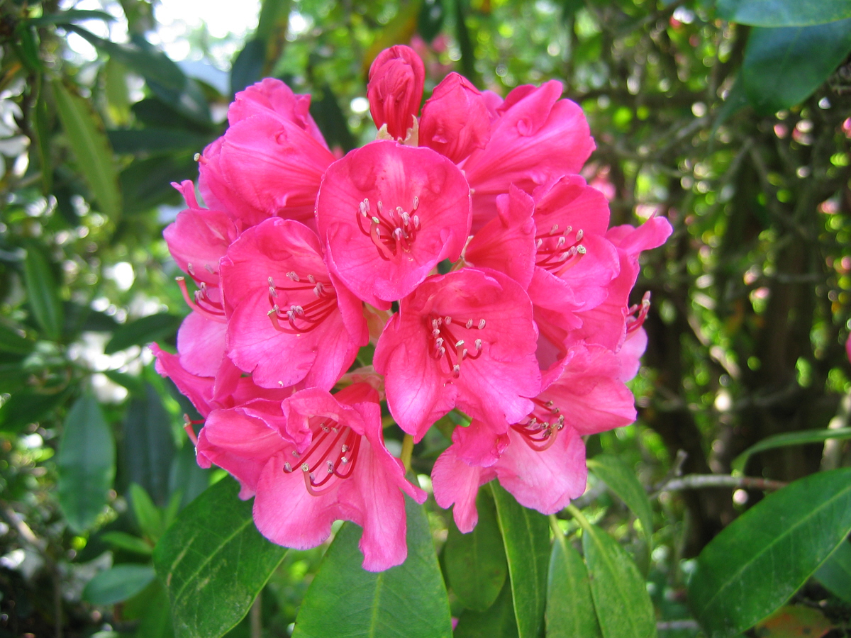 Flowers: c12 in an elongated truss, funnel-shaped, 40-45 x 50-55mm, rich coral pink, with a sparsely crimson dotted, dorsal lobe.