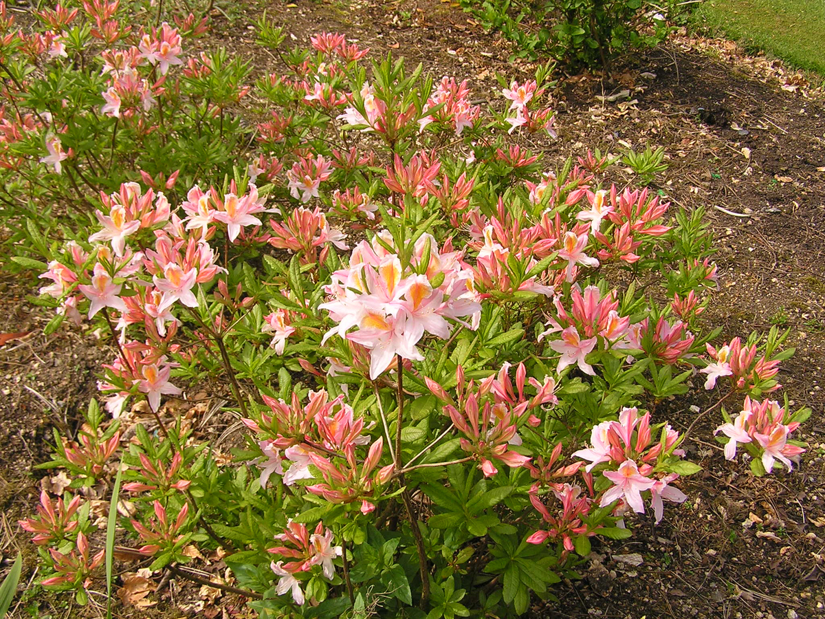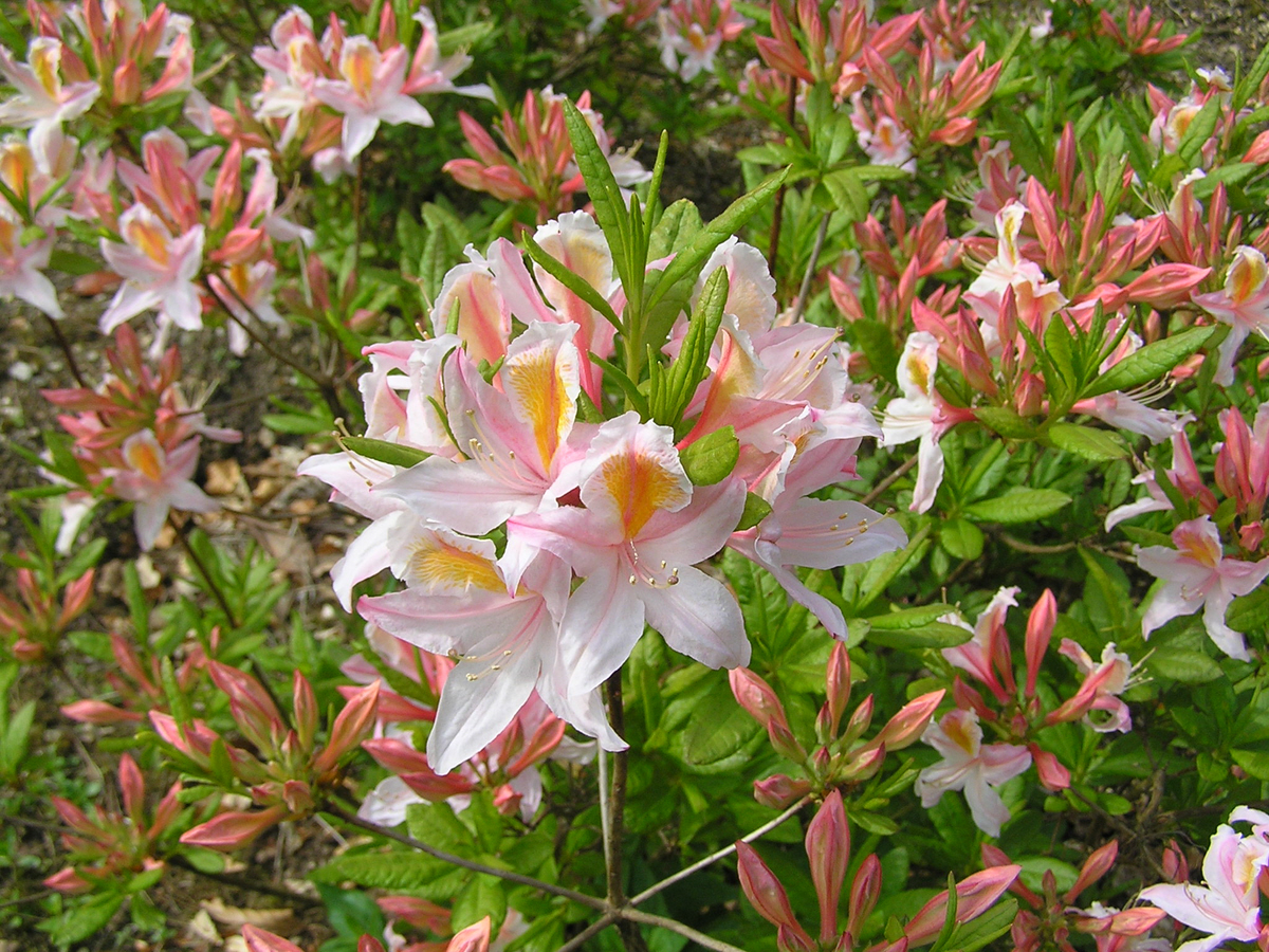 Flowers: pale cream flushed pink, with a yellow blotch; fragrant.