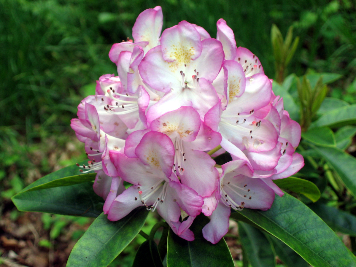 Rhododendron 'Eileen''Probably a maximum hybrid Flowers: 11-22/compact, conical truss, blush to white, with a moderate purplish pink edge and yellow markings. Early-mid June.
