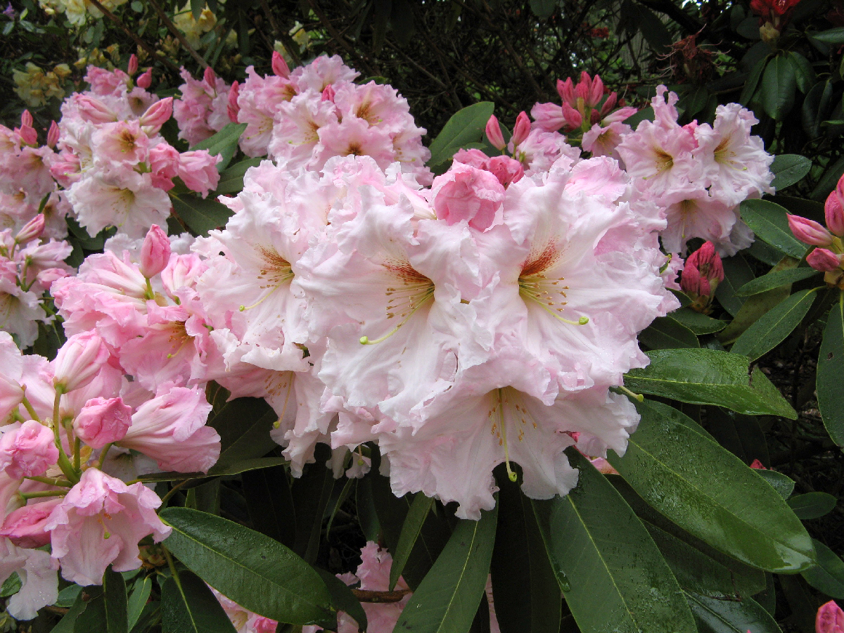Flowers: 12/truss, flattish funnel-shaped, 90 x 140mm, 7 lobes, pale blush pink outside at first, becoming white, with pale green spots inside.