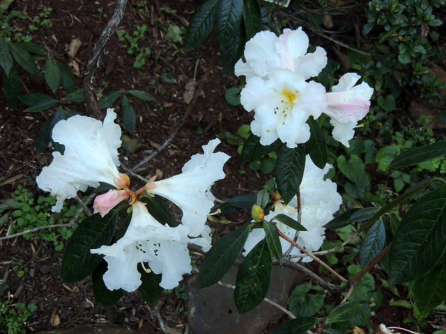 Flowers: lax trusses of 3-4 flowers, funnel-shaped, about 10cm across, heavily fragrant, white with a yellow flare, anthers brown.