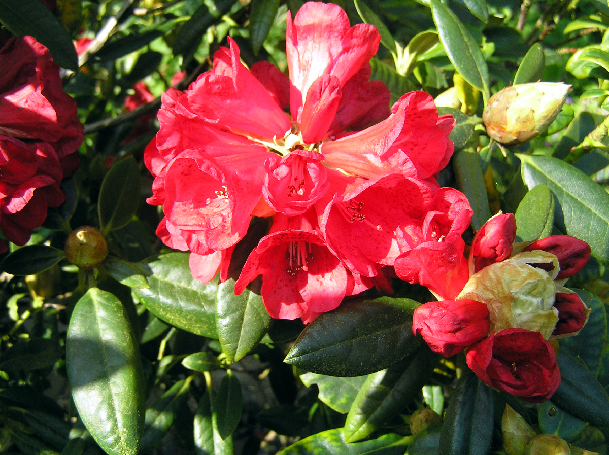 Flowers: 14/truss, broadly funnel-campanulate, 53 x 75mm, 5-lobed, strong red, lower 7mm of throat dark red, spotting dark red on all lobes, especially dorsal.