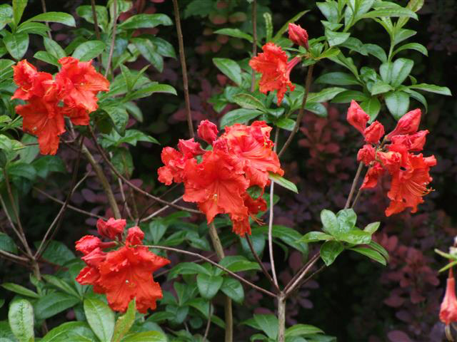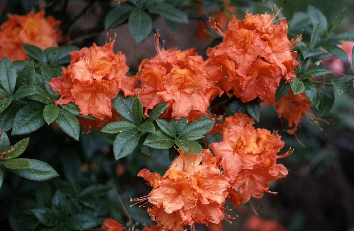 Flowers: large (to 6.5cm) with frilly edged petals; deep reddish orange in bud, opening to vivid flame