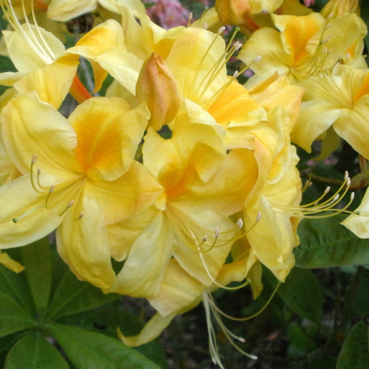 Flowers: up to 30/truss, funnel-shaped, 65 x 80-90mm, vivid yellow, tinged red, with a vivid orange-yellow blotch, lobes wavy-egded.