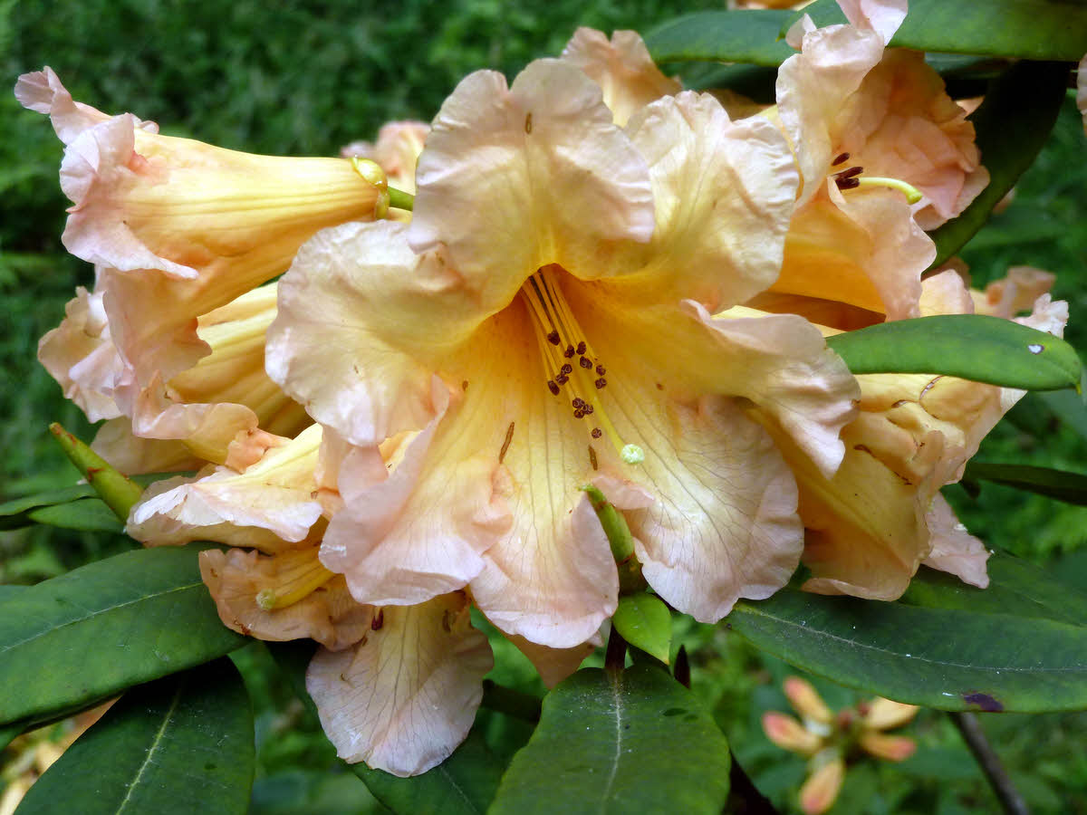Flowers: 8-10/lax, domed truss, funnel-shaped, with wavy-edged lobes, Egyptian buff, suffused shell pink at margin.
