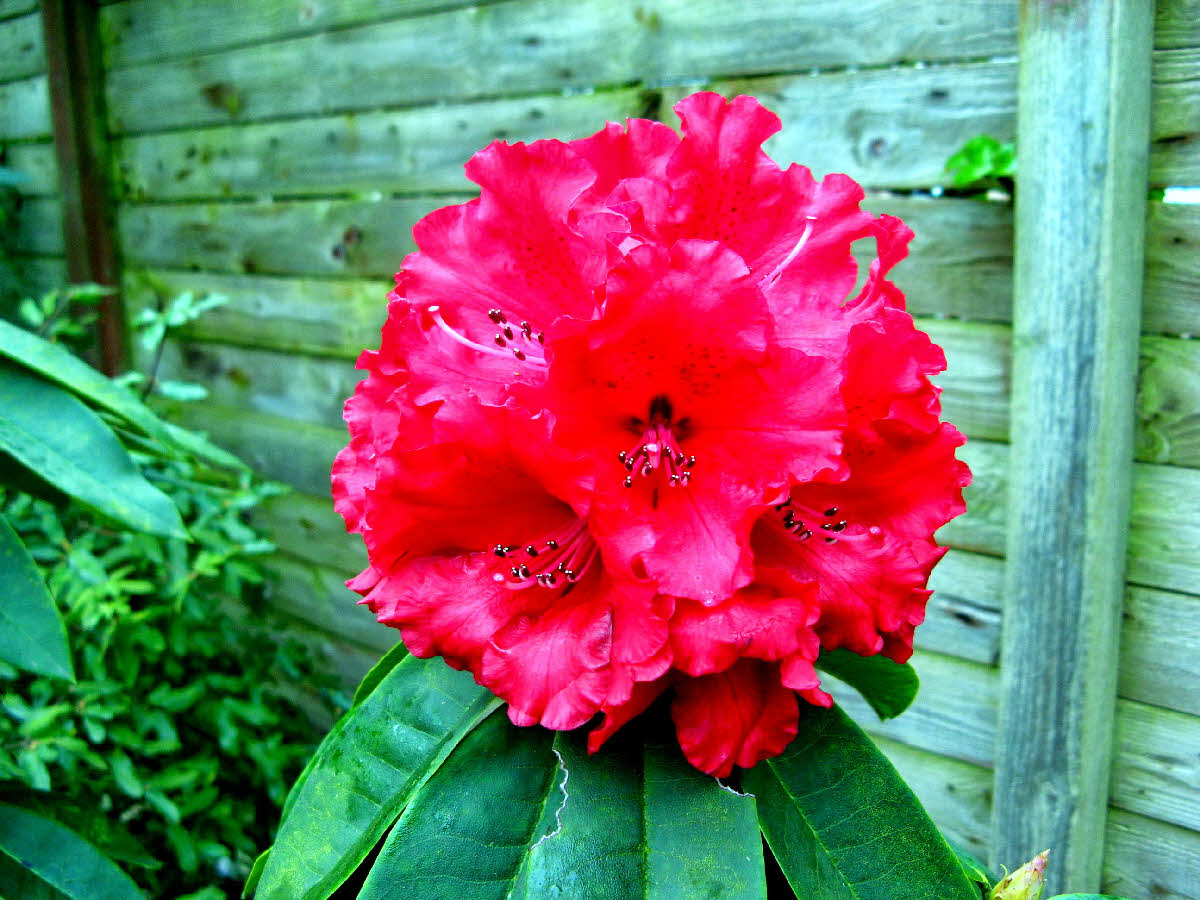 Flowers: in tight, ball-shaped trusses, funnel-shaped, up to 50 x 75mm, currant red at the margin, shading to blood red at the centre.