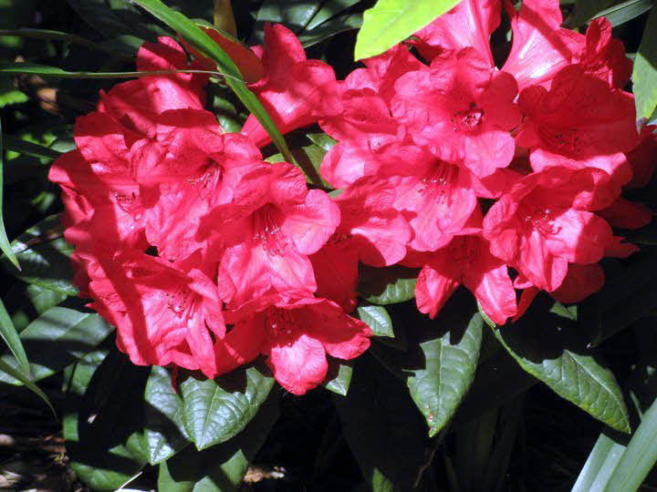 Flowers: in a semi-circular truss, 65 x 75mm, turkey red, spotted on dorsal lobe and with deep basal nectaries.
