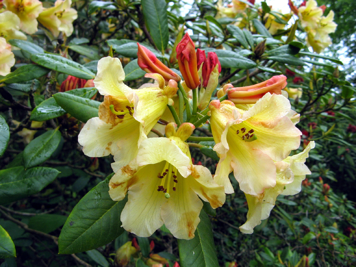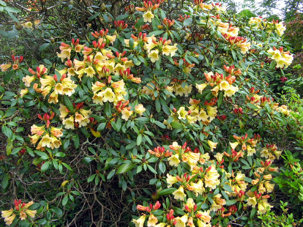 Rhododendron 'Hermes Group'dichroanthum ssp. apodectum x Lady Bessborough Group Flowers: in loose trusses, campanulate, orange-yellow with pink markings. May