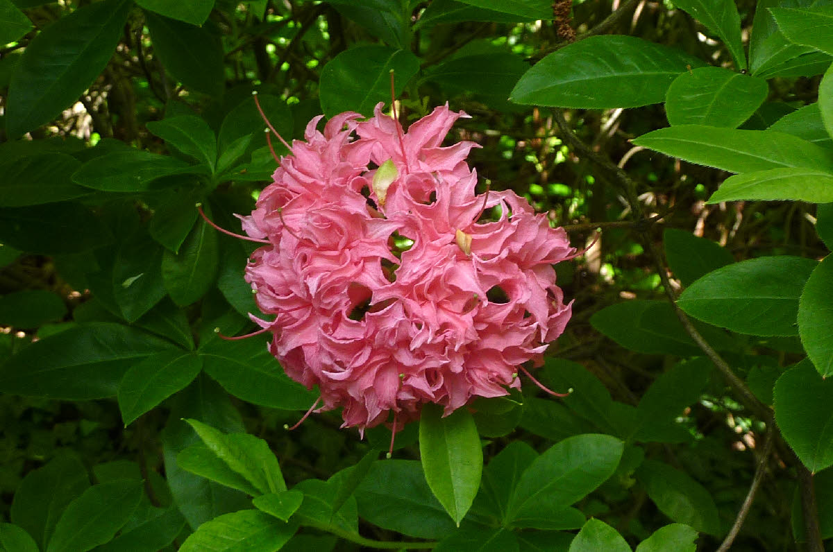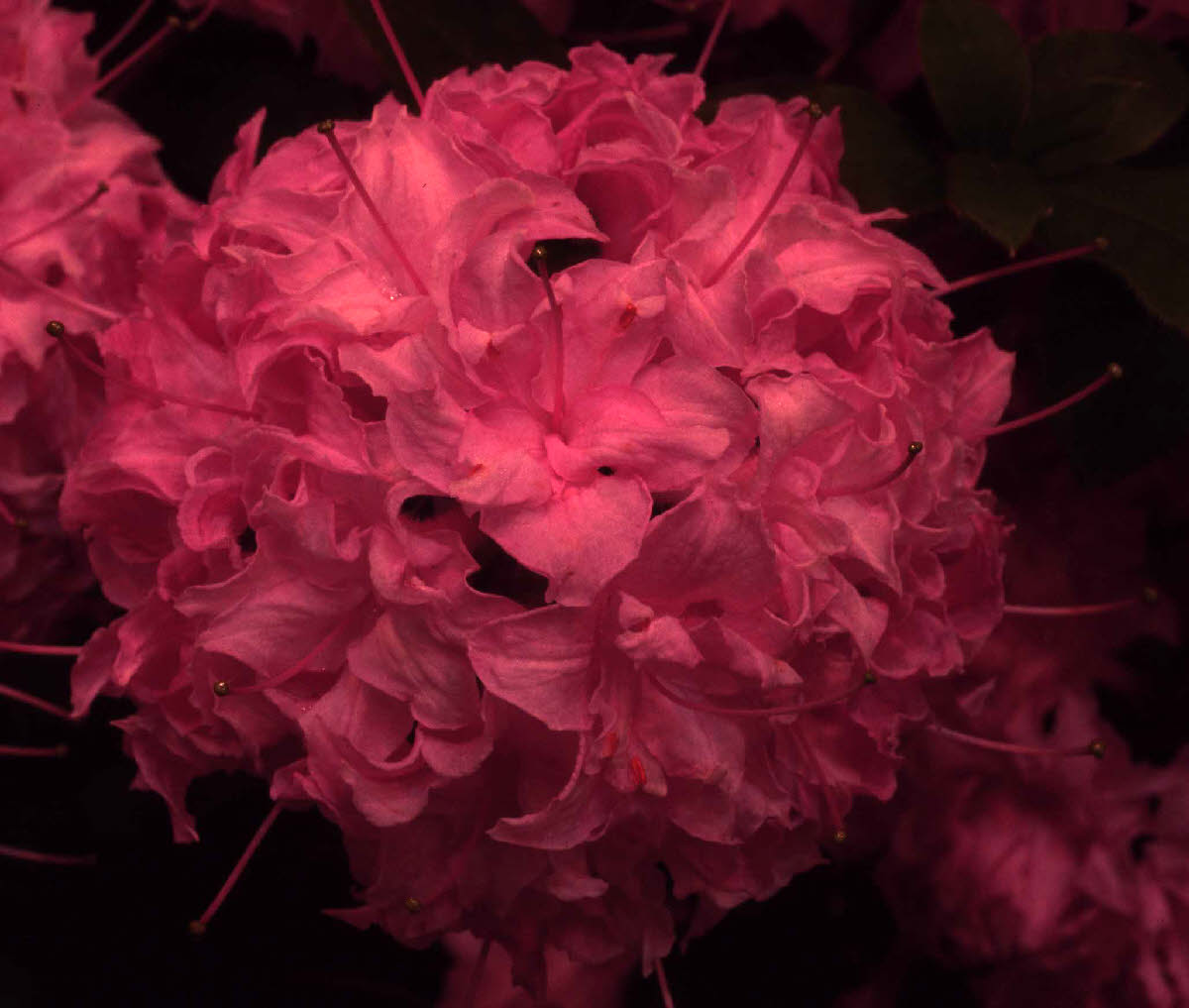 Flowers: tight rounded trusses of 14-16 open funnel shaped semi-double flowers (to 3cm); rose madder with paler shading.